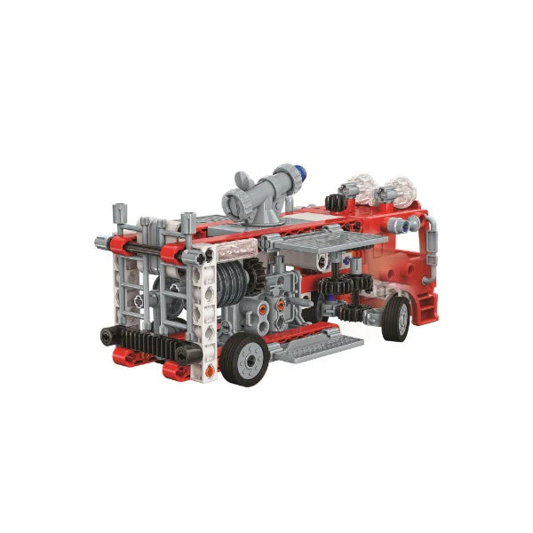 Incluye componentes y engranajes para construir un divertido vehículo de bomberos con sistema de dirección y cañón de incendios con bombas de agua, escalera modular de rescate, extintores y mucho más.