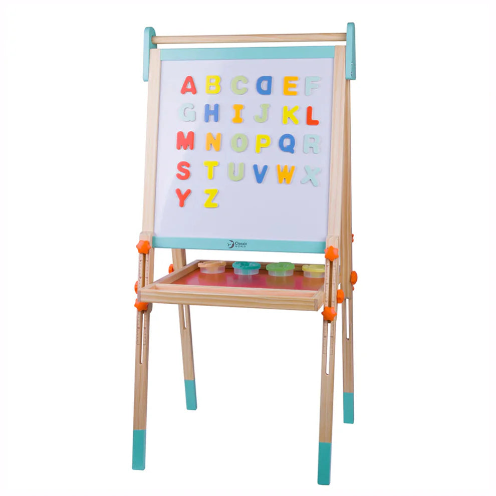 La pizarra atril plegable tiene una pizarra para dibujar con tizas y una pizarra magnética para que los niños creen bonitos dibujos y tambien puedan dibujar con marcadores lavables. La escala en los marcos laterales es para un fácil ajuste de altura. Incluye vasos de pintura plástica y alfabetos magnéticos.