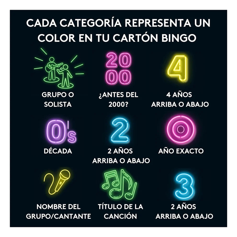 Sé el primero en completar una fila o columna con las cuatro categorías diferentes para coronarte campeón del Hitster Bingo.